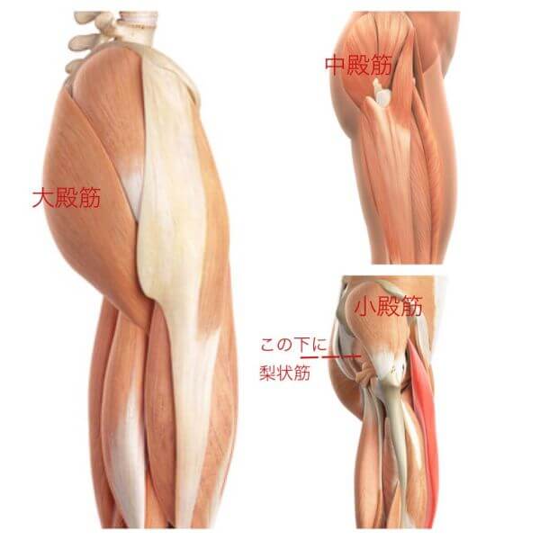 大殿筋の下には、中殿筋、小殿筋、そして梨状筋、腸脛靭帯や大腿筋膜腸筋など、多層構造になってい深層筋には鍼とお灸でほぐすのが一番効果があります。